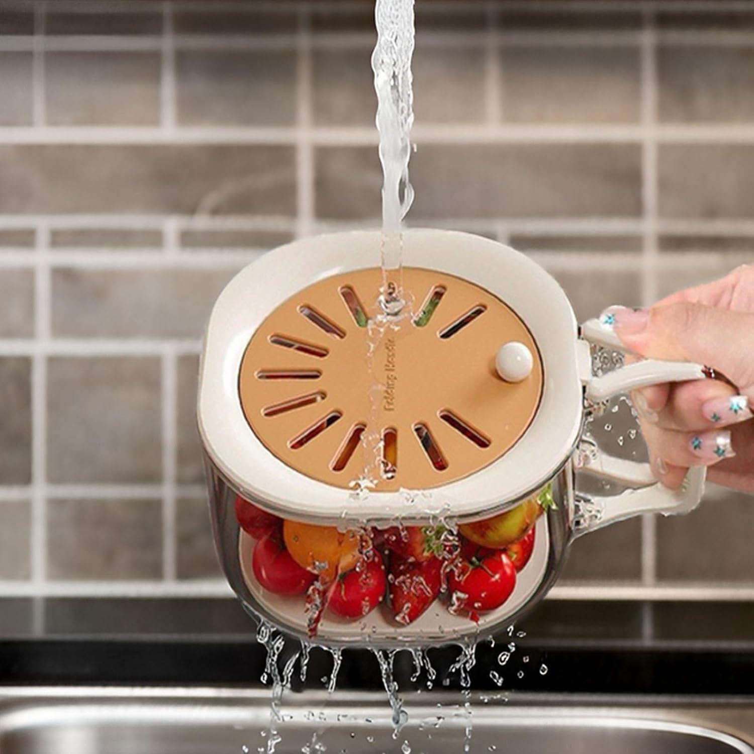 A compact and multifunctional fruit and vegetable drain basket with dual-layer design, ideal for washing, draining, and serving fresh produce.
